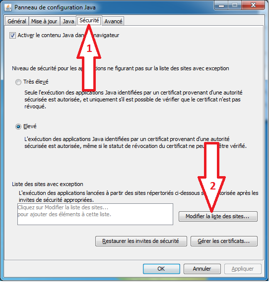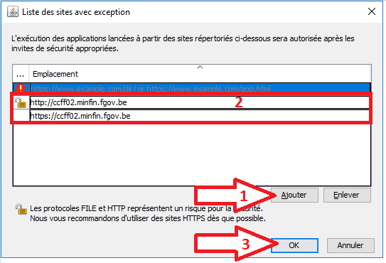 Attention: lors de l'ajout d'un site dans les exceptions, vous recevrez un avertissement de sécurité. Il suffit de cliquer sur le bouton "Exécuter" pour continuer.